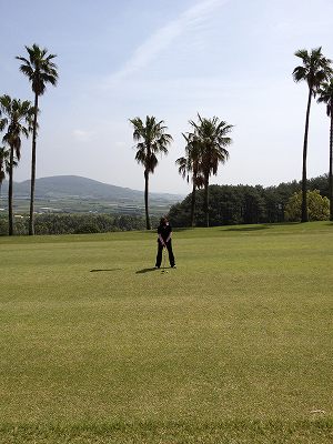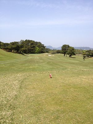 15番ミドル 緩やかなのぼり左ドックレックのミドル 雄大な開聞岳に向かってボールを運ばせる